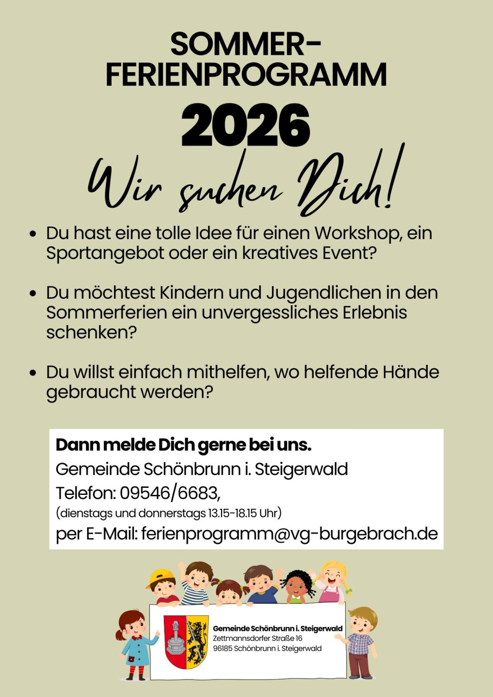 Die Bewerbungen nimmt Erster Bürgermeister Dirk Friesen unter Tel. 09546/6683 bzw. per E-Mail d.friesen@vg-burgebrach entgegen.