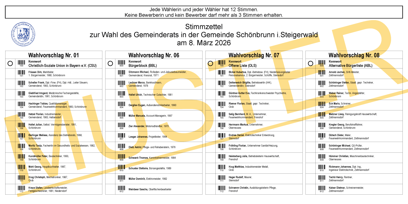 Weitere Informationen zu den Kommunalwahlen am 08. März 2026 finden Sie auf der Homepage des Landkreises Bamberg. Dort können Sie Musterstimmzettel für die Landratswahl 2026 und die Kreistagswahl 2026 aufrufen.