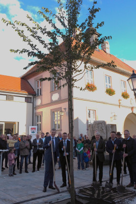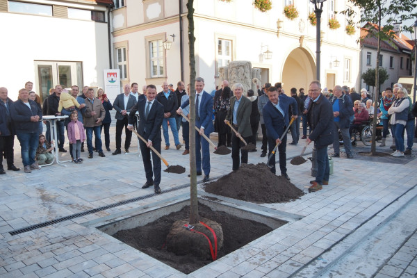 Ein besonderes Augenmerk galt auch dem historischen Brunnen, der nun auf der Westseite des Rathaustores seinen neuen Platz gefunden hat. Das Kunstwerk – ein Lebensbaum - von Reinhard Klesse (1981) symbolisiert mit vier Motiven die Geschichte Burgebrachs: die Urkundenverleihung 1023 (Wildbann Steigerwald), eine Szene von der Hohen Jagd, die Zehntabgabe und die Darstellung vom Jahrmarkt. „Am Brunnen vor dem Tore“ steht aber nicht ein Lindenbaum, so Johannes Maciejonczyk, „heute pflanzen wir symbolisch zur Fertigstellung der Maßnahme eine Hopfenbuche.“ Die Städtebauförderungsmittel seien in Burgebrach gut angelegt, so Regierungsvizepräsident von Oberfranken, Thomas Engel. Die durchgeführte Ortskernsanierung gebe dem Ortskern ein neues Kleid, Plätze mit Aufenthaltsqualität, eine bessere Barrierefreiheit. Außerdem wurden auch Leerstände beseitigt.