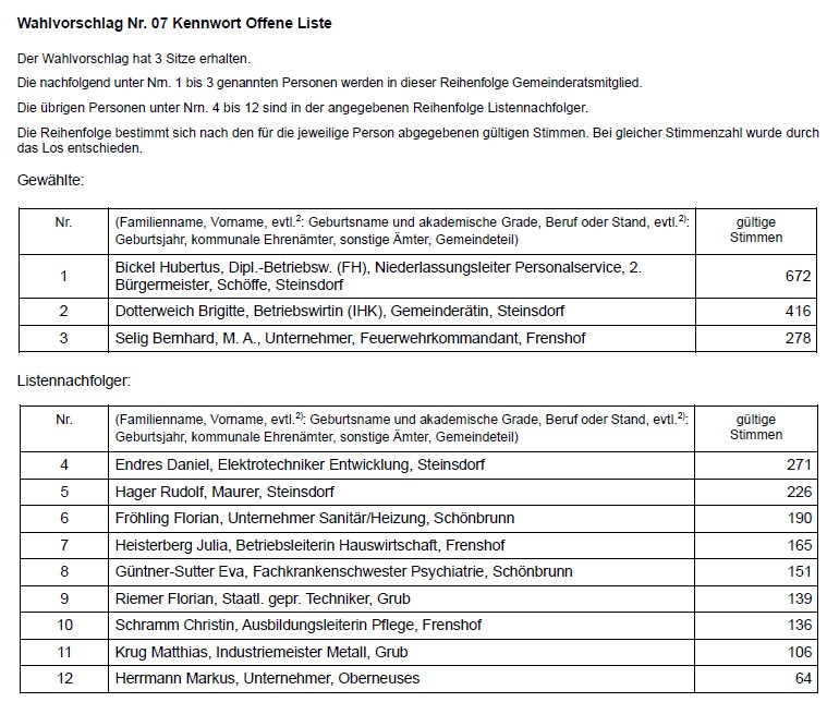 Der Wahlausschuss hat in seiner Sitzung am 16.03.2026 folgendes abschließendes Ergebnis der Wahl des Gemeinderats festgestellt: