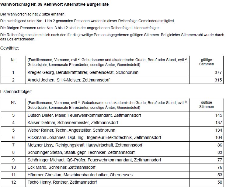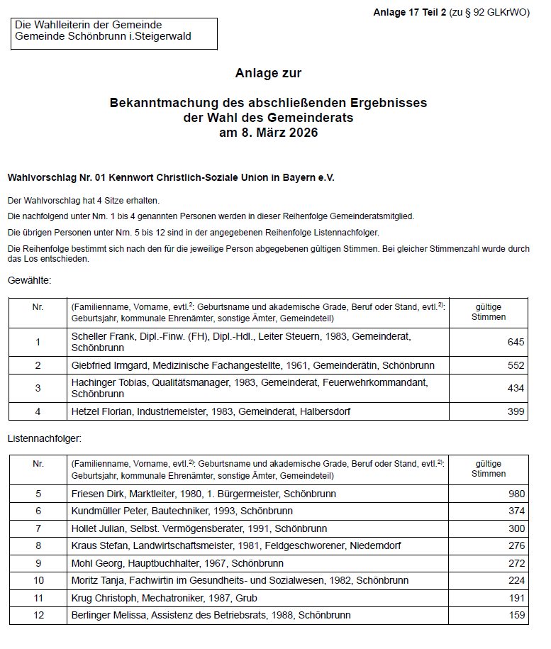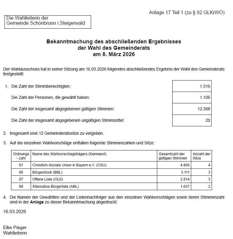 Die Wahlleiterin der Gemeinde Schönbrunn i. Steigerwald - Bekanntmachung des abschließenden Ergebnisses der Wahl des Gemeinderats am 8. März 2026