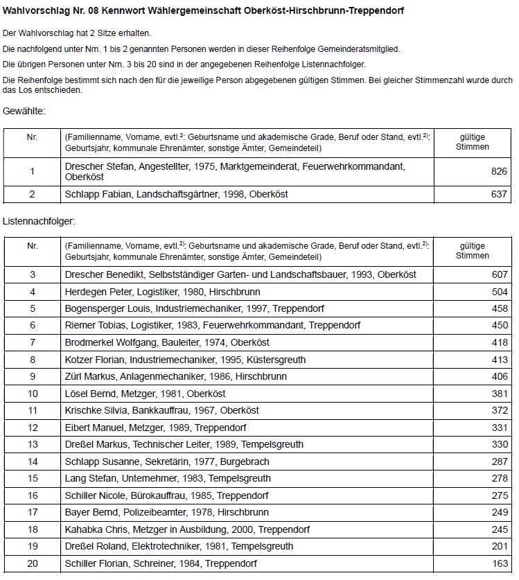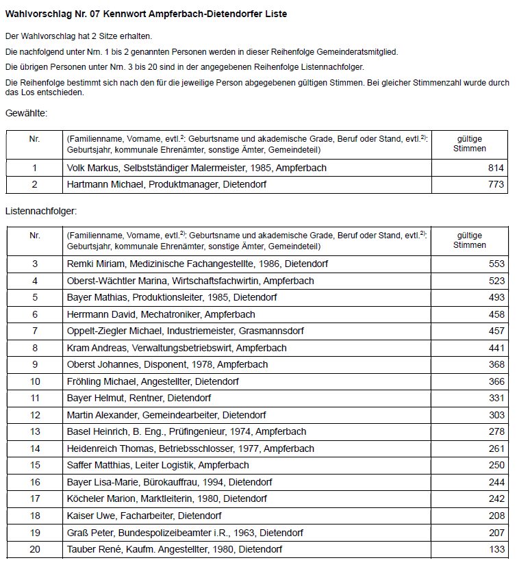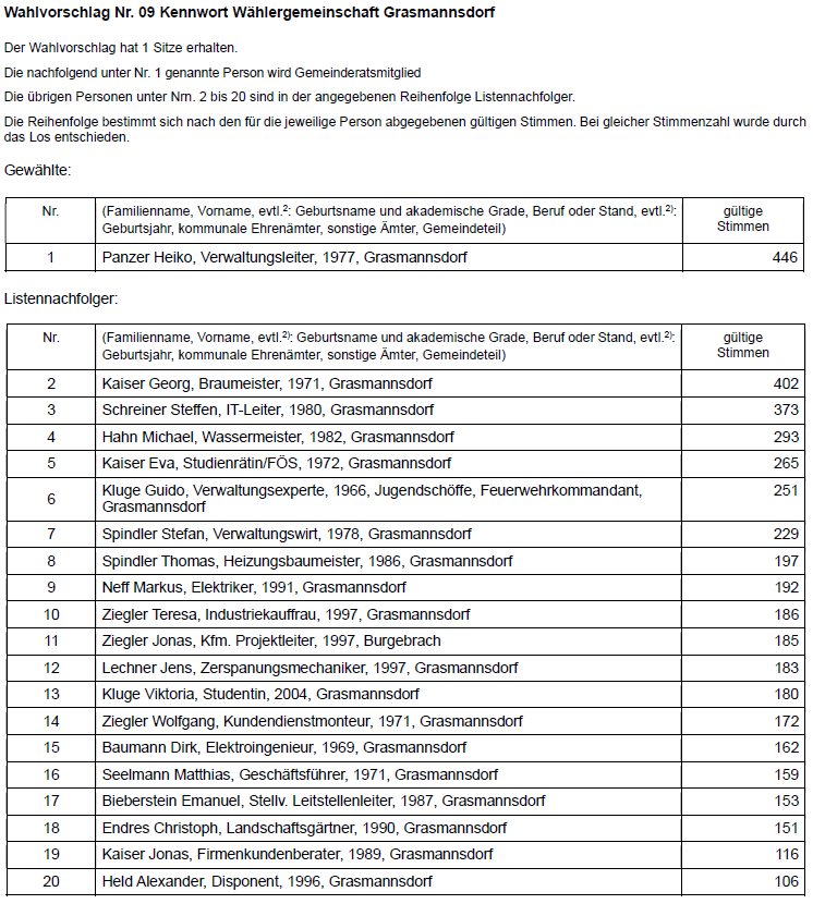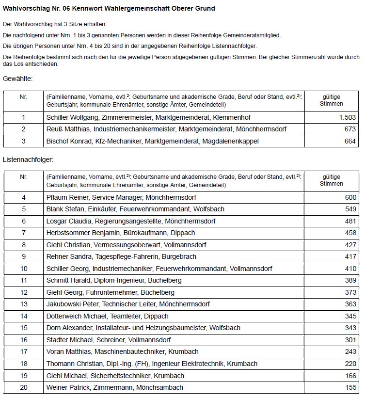 Der Wahlausschuss hat in seiner Sitzung am 16.03.2026 folgendes abschließendes Ergebnis der Wahl des Gemeinderats festgestellt:
