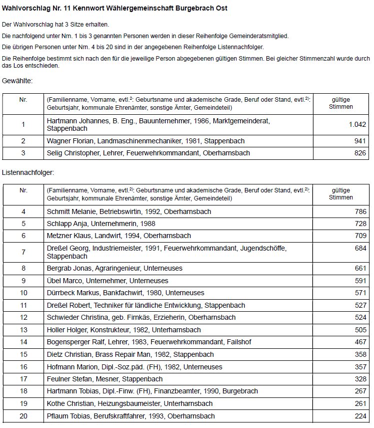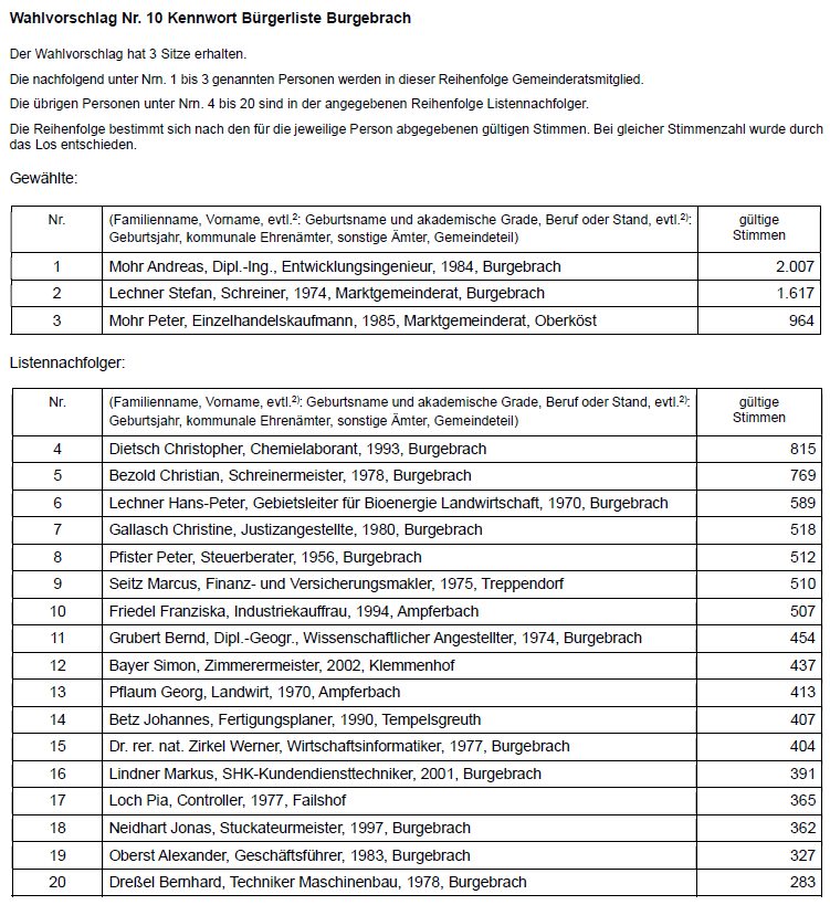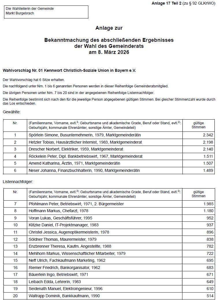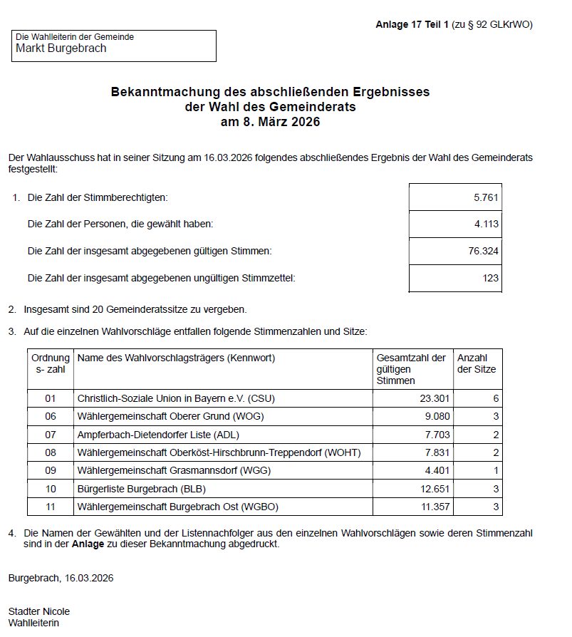 Die Wahlleiterin des Marktes Burgebrach - Bekanntmachung des abschließenden Ergebnisses der Wahl des Gemeinderats am 8. März 2026