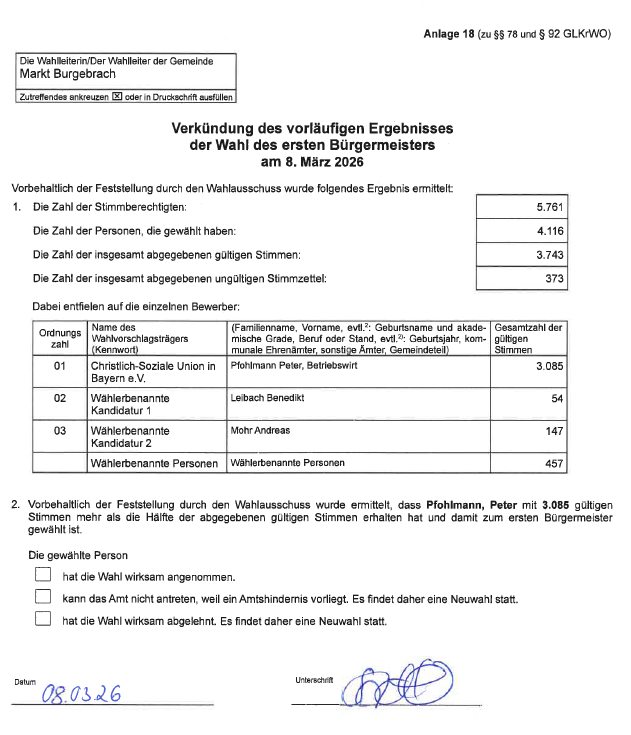 Die Wahlleiterin des Marktes Burgebrach - Verkündigung des vorläufigen Ergebnisses der Wahl des ersten Bürgermeisters am 8. März 2026