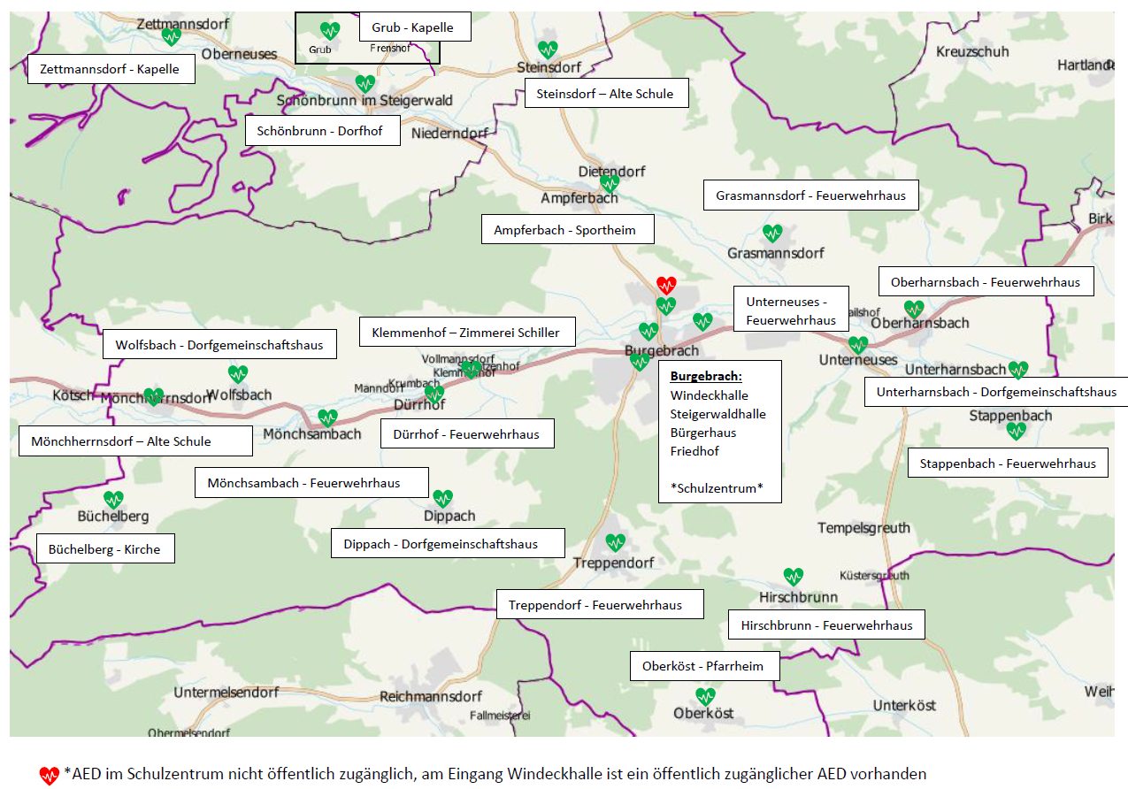 Im Gebiet der Verwaltungsgemeinschaft Burgebrach sind solche automatisierten externen Defibrillatoren (AED) an folgenden Orten zu finden: